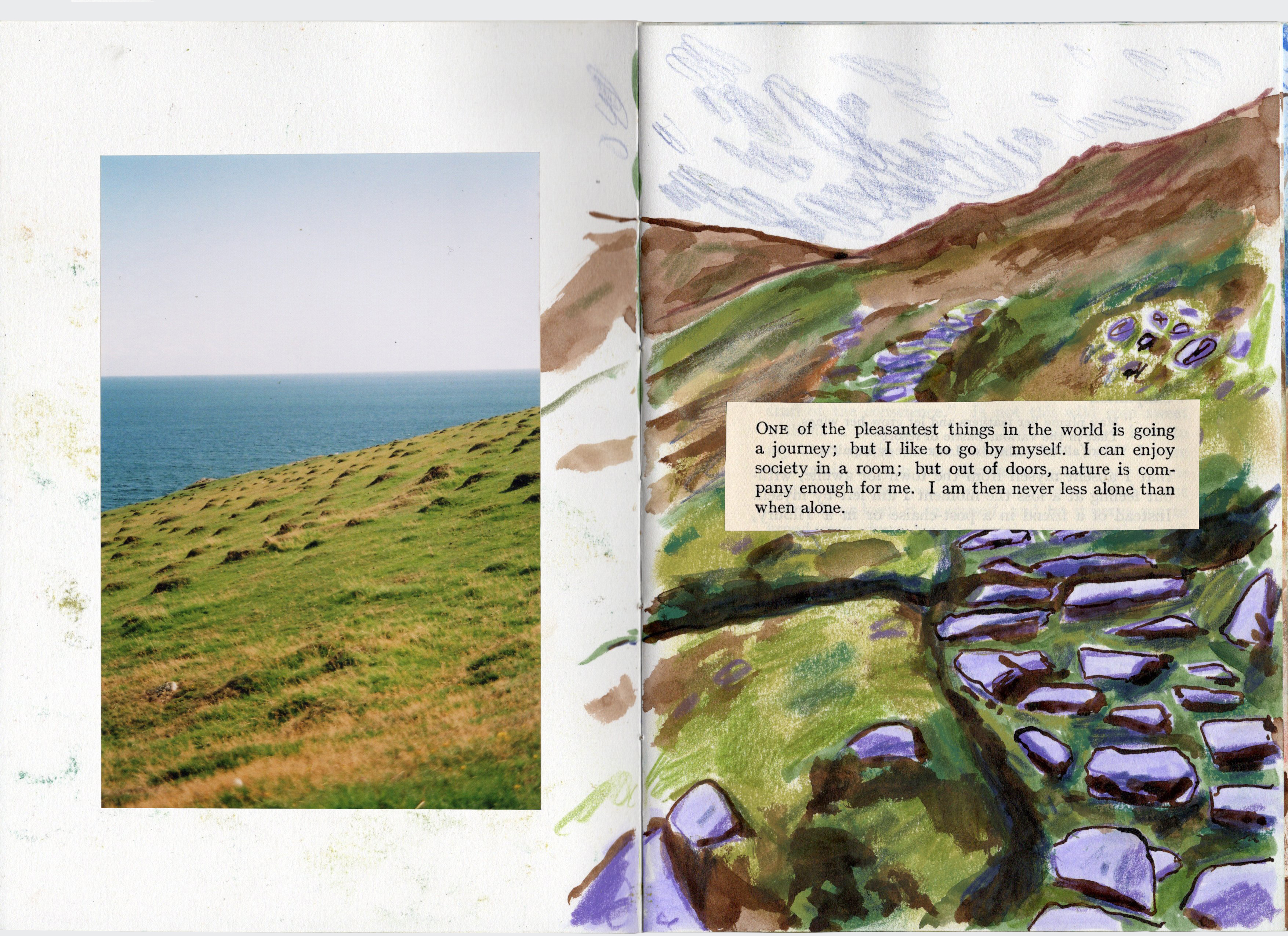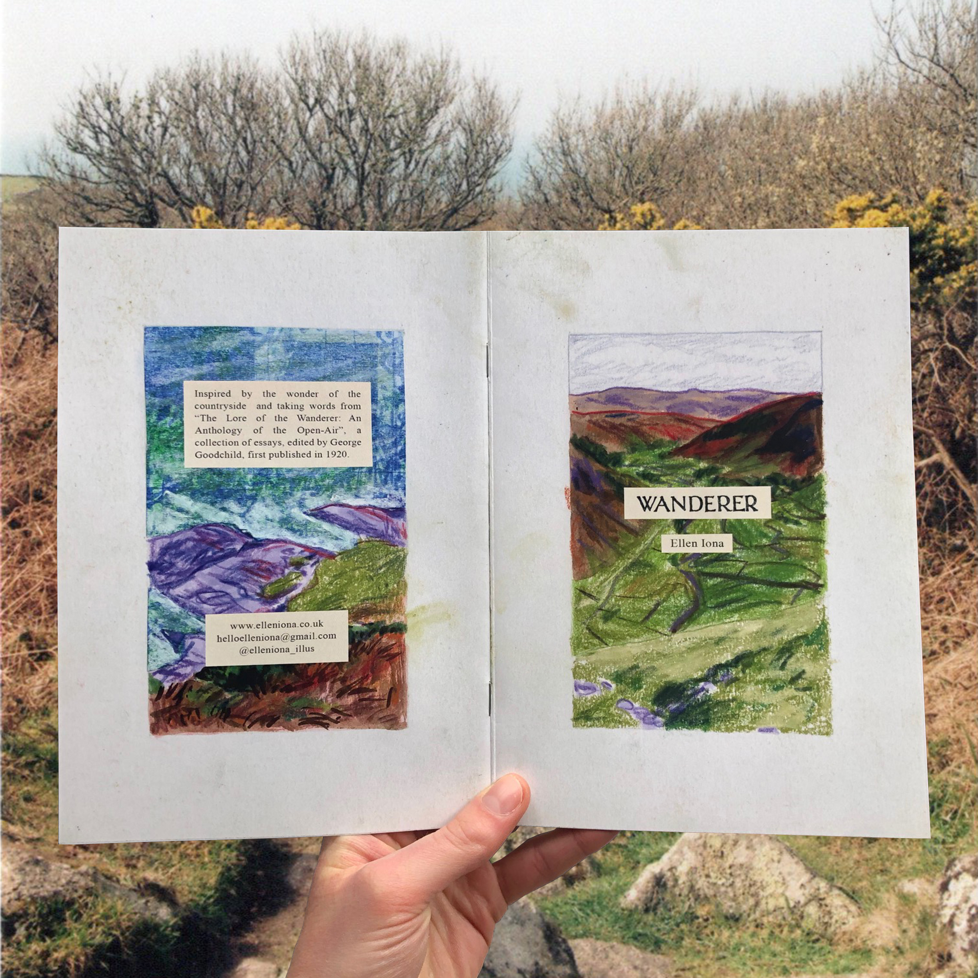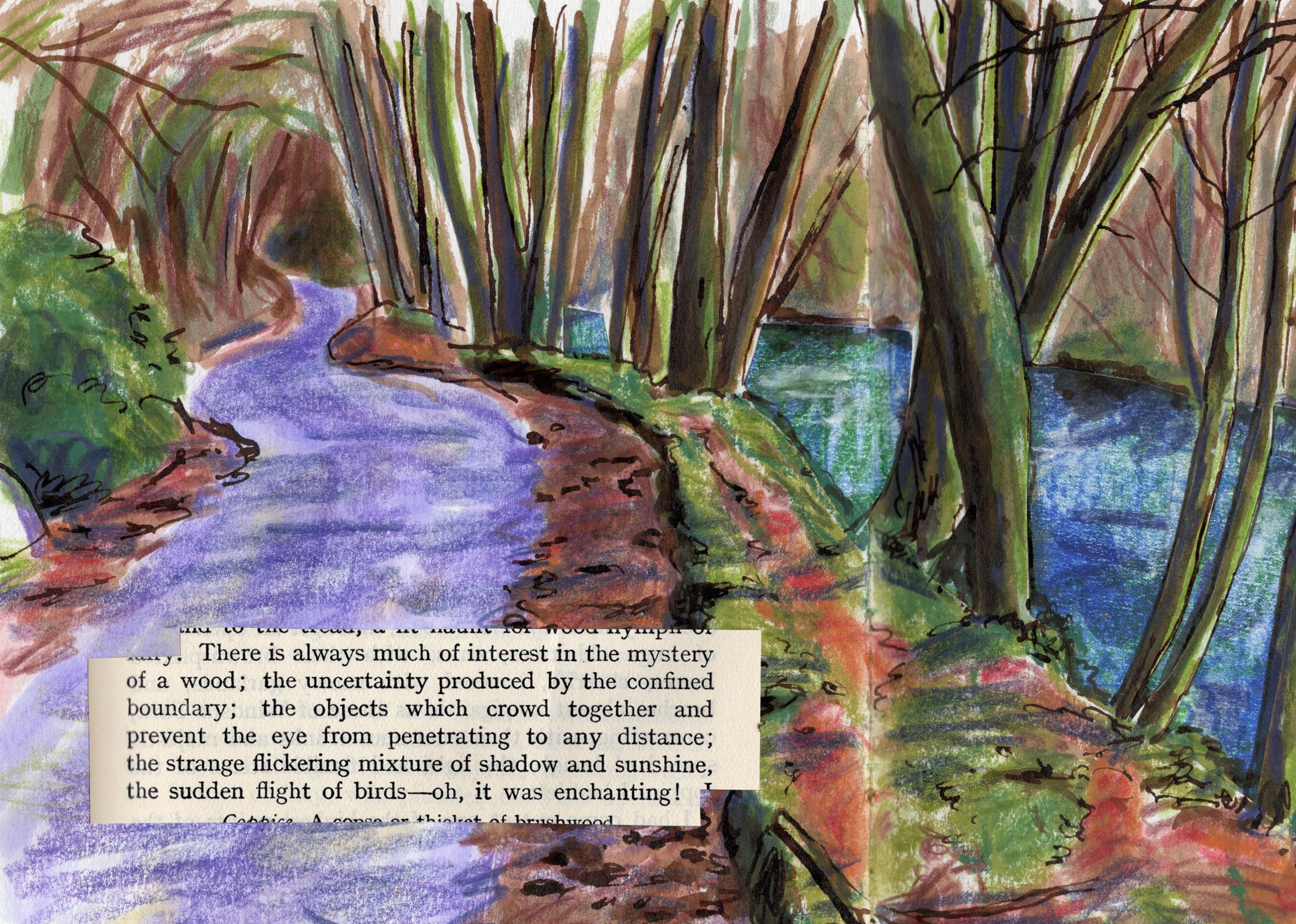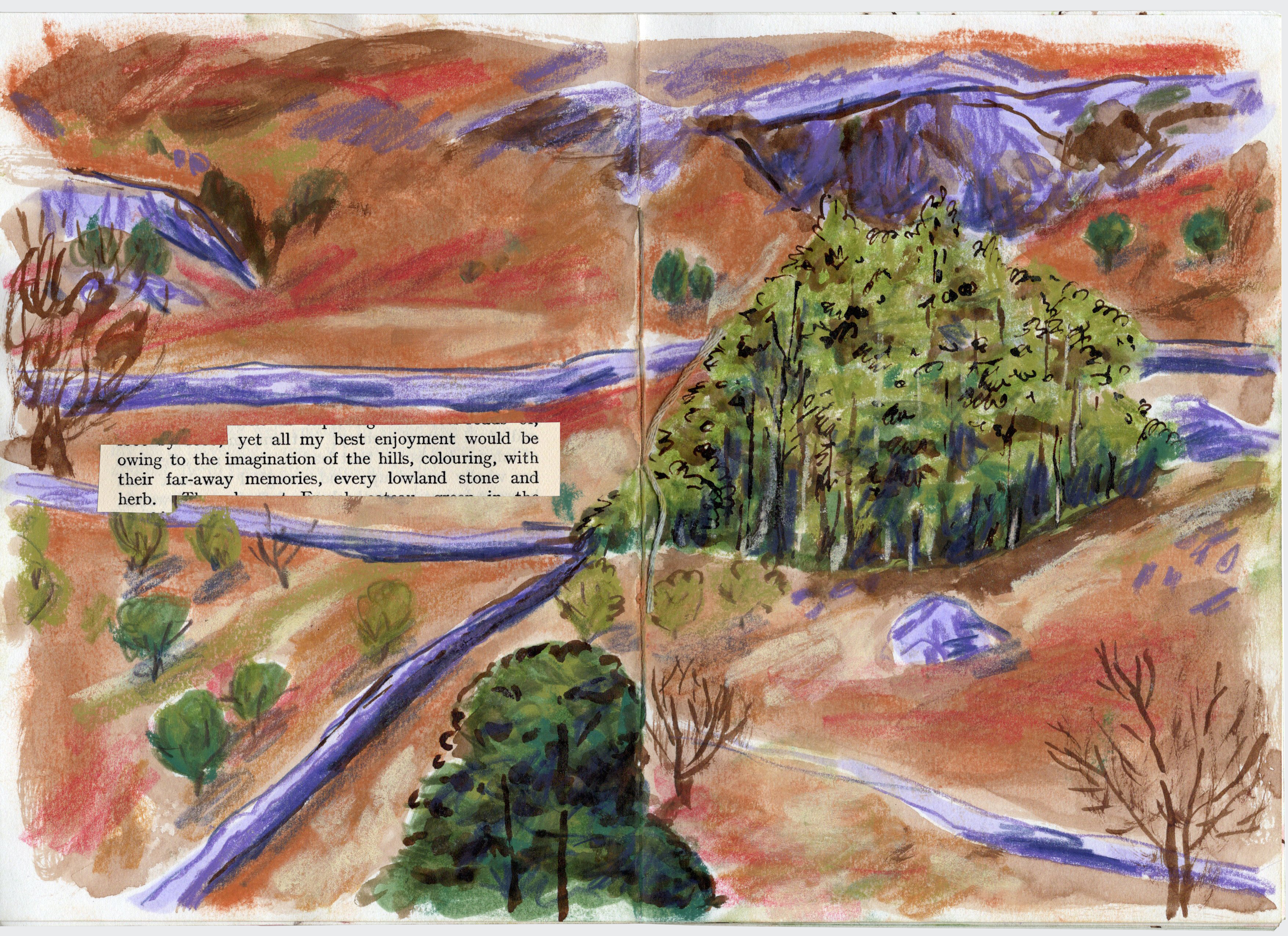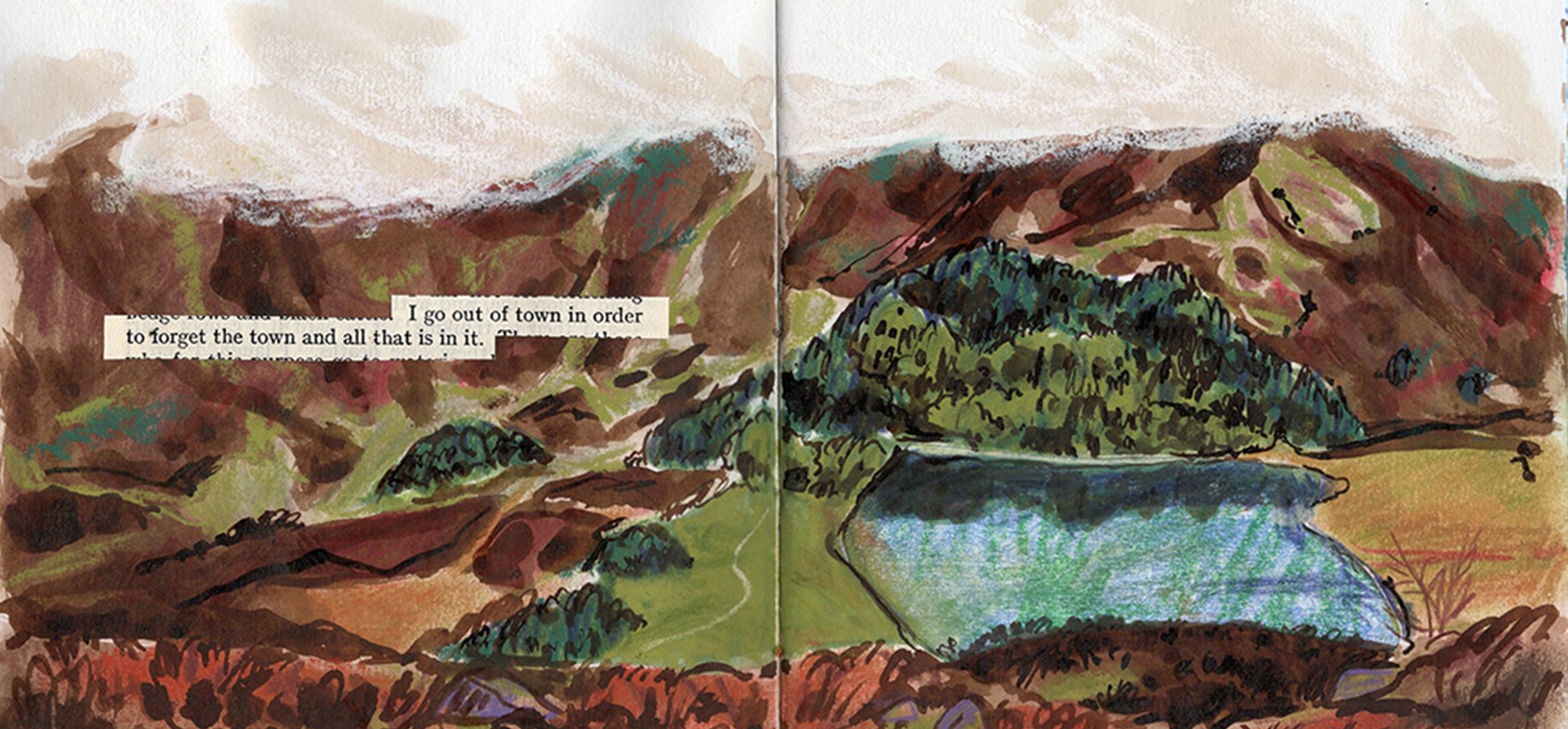 Combining words taken from “The Lore of the Wanderer: An Anthology of the Open-Air” (first published in 1920) and drawings inspired by on site drawings to describe the joy of the outdoors and the pleasure to be taken in wandering.